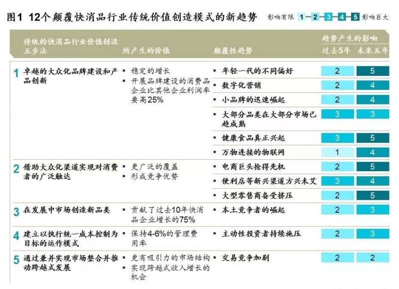 近几年快消品行业逐渐褪去往日的光环,其有机增长速度在扣除并购、汇率和通胀等影响后仅有2.7%。为什么传统的价值创造模式在这个时代无法继续带动增长?麦肯锡通过对全球消费品行业的深入研究后发现:12个以技术驱动的颠覆性趋势正在或即将打破市场格局,导致传统模式失灵(见图1)。