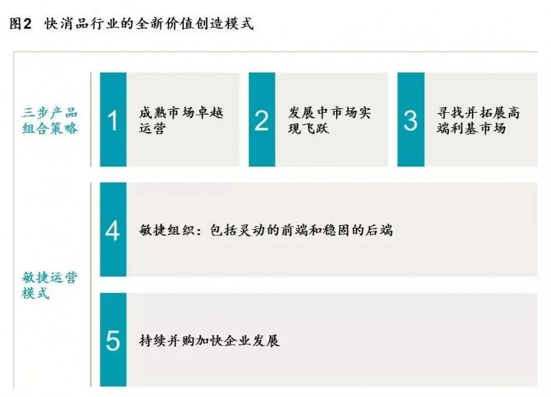 要想生存,快消品企业需要一套新的价值创造模式(见图2)。其核心是从单纯聚焦大众化品类策略转变为三步产品组合战略。同时,辅以敏捷运营来有效支持新战略部署,并将并购作为关键的增长加速器。