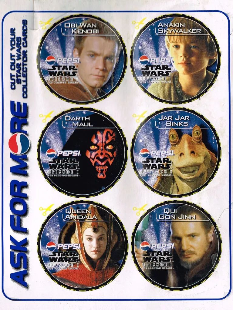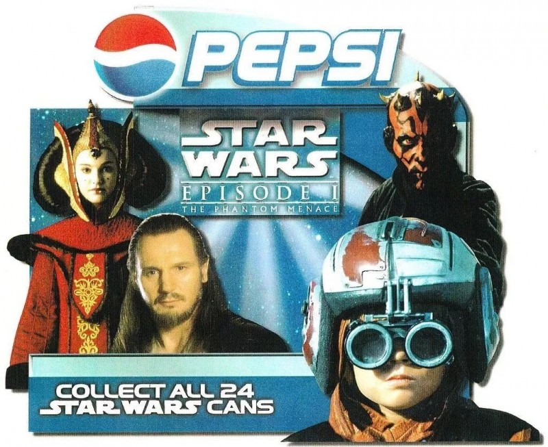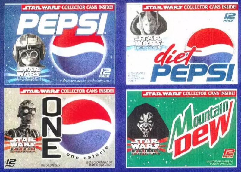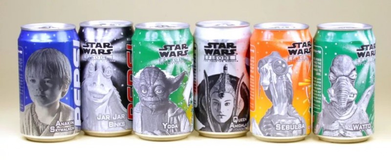 1999年夏天,令无数影迷为之疯狂的《星球大战前传1:幽灵的威胁》在美国上映,Pepsi乘势推出了以《星球大战》角色为外包装的限量可乐罐。