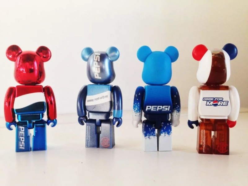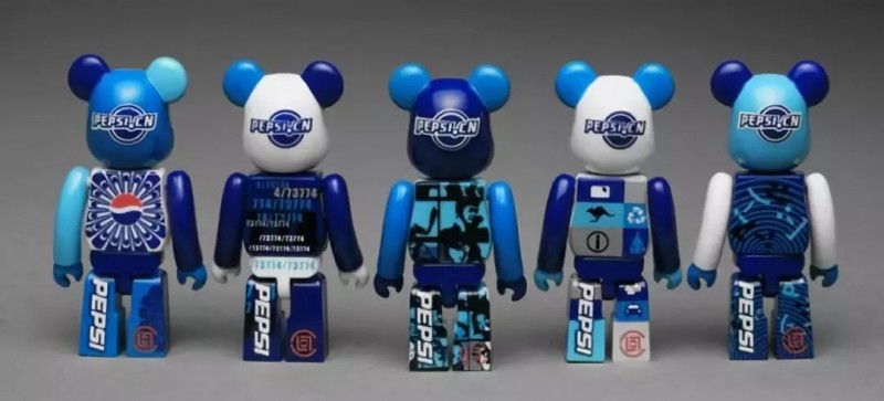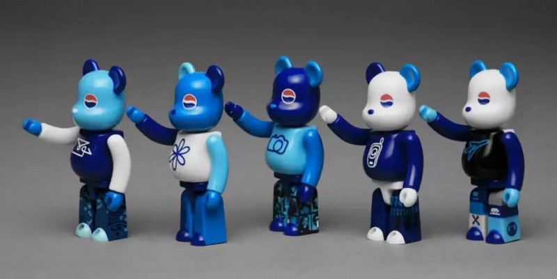 Pepsi、陈冠希主理的香港潮牌CLOT与BE@RBRICK,三家多次联名推出限量款“积木熊”,熊的主体以百事可乐标志性的蓝色为主色调,在它的左眼还能找到百事特有的LOGO。