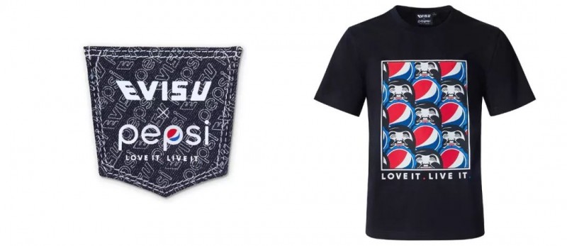 ▲ Pepsi x Evisu联名合作单品,左为牛仔零钱包,右为印花T恤