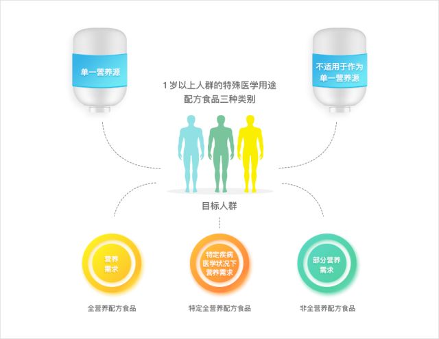 适用于 1 岁以上人群的特殊医学用途配方食品: 包括全营养配方食品、特定全营养配方食品、非全营养配方食品。