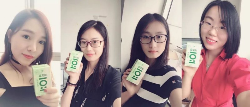 当然还有大家关心的口感,食品板美女小编们纷纷试喝,抢鲜体验新品,我们给出的反馈就是:豆香醇厚,喝起来不是很甜,无负担!