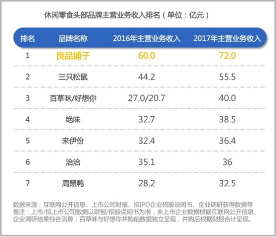 从互联网公开信息、上市公司财报、拟IPO企业招股说明书等提供的数据来审视休闲零食市场竞争格局,休闲零食头部品牌前七名依次为良品铺子、三只松鼠、百草味/好想你、绝味、来伊份、洽洽、周黑鸭。