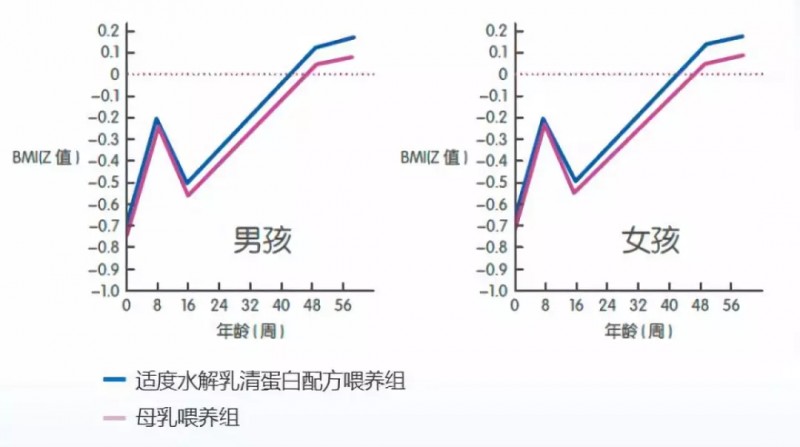 GINI 研究 6 年结果:100% 适度水解乳清配方组 vs 母乳喂养组婴幼儿生长发育曲线