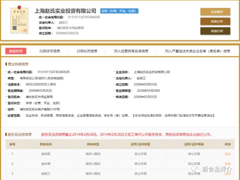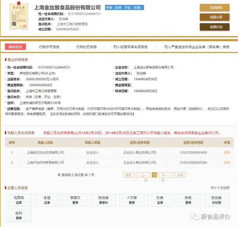 值得注意的是,作为股东之一的“上海赵氏实业投资有限公司”,其法定代表正是金丝猴的创始人赵启三。