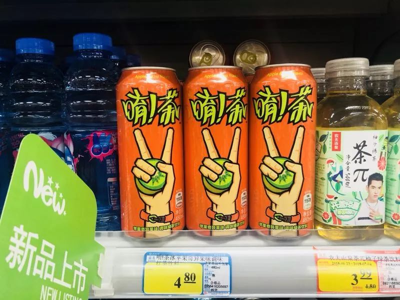 唷!茶是可口可乐今年推出的茶饮料,采用瓶装和摩登罐两种包装,目前有冰冽金桔红茶、苹果奇异果绿茶和混合莓果红茶。包装采用黄蓝橙三种亮色,配上具有街头感的手势,以及”飞一下,别拘着”的广告语,让产品充满嘻哈风格。