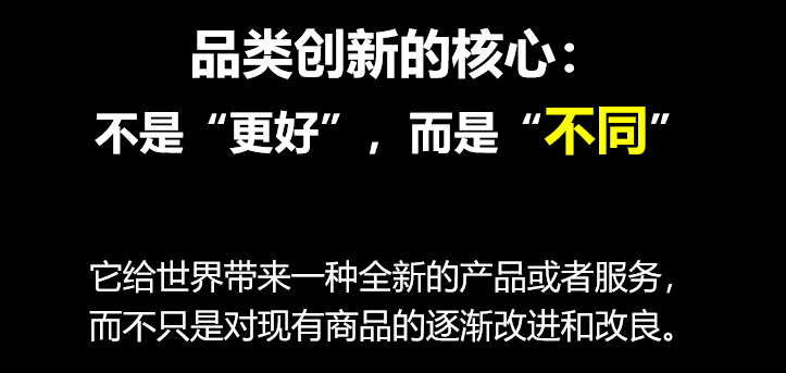 品类创新是其中的核心部分。品类创新的一个重要观念,就是带来不同的内容。我们发现,很多企业家都有一个观念,一直盯着对手想要做得比对手更好。这样是不会奏效的。事实上,即使你做得更好,也很难让消费者认知到这一点,因为消费者会认为:如果你说你做得更好,那你为什么没有卖得更好?因此,企业家要学会转换焦点和思维,要做全新的品类,要发现不同。