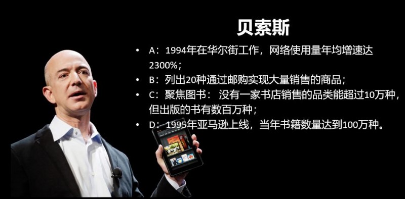 发现成长极,是发现新品类非常重要的原因。亚马逊的诞生也是如此。贝佐斯发现互联网的成长速度非常高,远远超过其他行业,于是想要在互联网上搞点事情。然后,贝佐斯列了一个清单,排列出了十个类别,发现在这十个类别中图书非常少。图书没有什么售后服务,最关键的一点是线下书店放不了这么多书,于是,贝佐斯就做起了线上书店。
