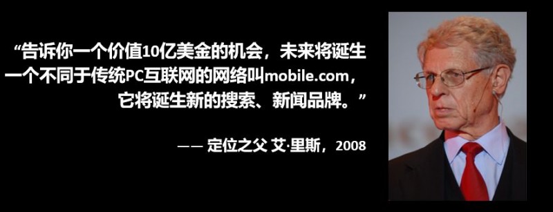 此外,“品类”的意识也能发现新品类。新品类很多时候不需要你来发明,而是要求你要有品类意识。什么是品类的意识?例如,线下是一个品类,而移动互联又是一个品类,会产生基于移动互联的品牌和新品类,这是非常好的例子。2008年的时候,里斯先生在北京接受《中国企业家》杂志专访的时候,曾经说过这样的话: