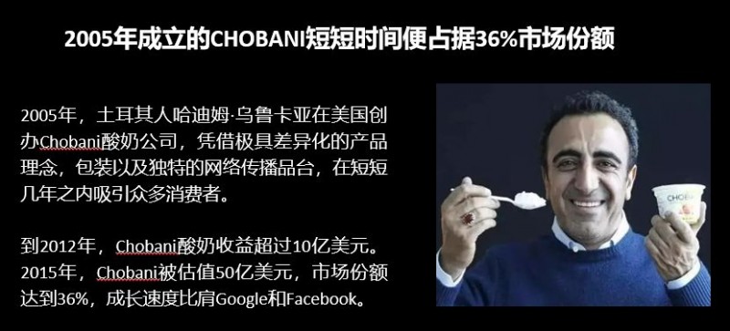 另外我想要特别强调的是,定义新品类也非常重要。很多企业虽然知道自己要做不一样的产品,但它并没有率先定义这个品类。这里举一个定义品类最成功的例子:乔巴尼希腊酸奶。