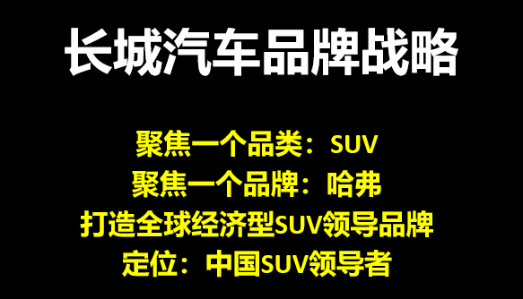 我们为它做的战略就是:聚焦一个品类、打造一个品牌。这样一来,问题首先就变成了:聚焦哪个品类?通过对全球市场和中国市场的趋势研究,我们认为SUV是最有机会的,尽管那个时候SUV的市场份额还很小,在当时中国乘用车市场占比仅5%。但是里斯中国团队硬是在这5%的时候说服了长城汽车来聚焦SUV,这也是里斯中国为长城汽车做出的最重要的贡献。