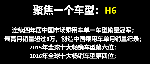 里斯中国团队在研究之后认为,城市型SUV将会是未来的趋势,因此建议长城汽车聚焦资源打造城市型SUV,也就是H6。直到今天,H6依然是中国第一SUV。为了让品类和品牌更为专业,里斯中国团队再次建议长城汽车将哈弗品牌独立,变成一个专家品牌。H6已经连续四年成为中国单一车型的销量冠军,进入全球前四名销量最好的车型。