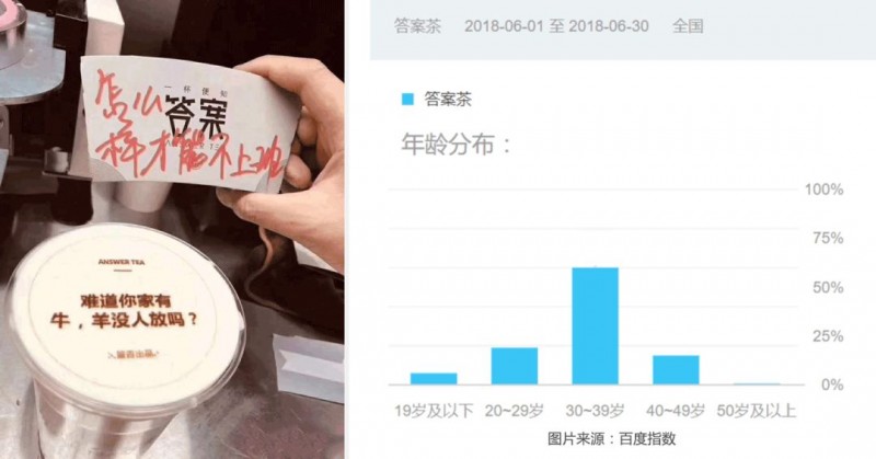 以年初很火的抖音网红美食代表“答案茶”为例,小编看了看百度搜索的数据,发现最关心这股风潮的明明是30多岁的“叔叔阿姨”好吗?!