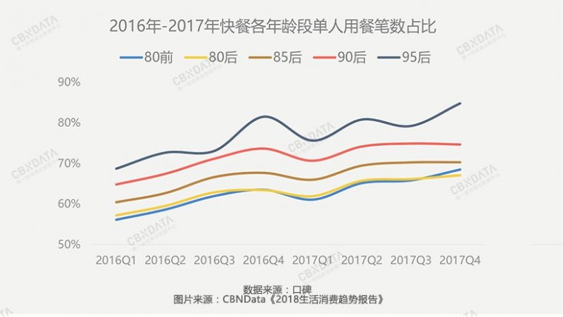 数据显示,在外卖平台上从“组团叫餐”转变为“一人用餐”是整体性的发展趋势,但对比各年龄段,可以看到95后是“一人食”次数最多的群体,把90后、80后甩在了后头。