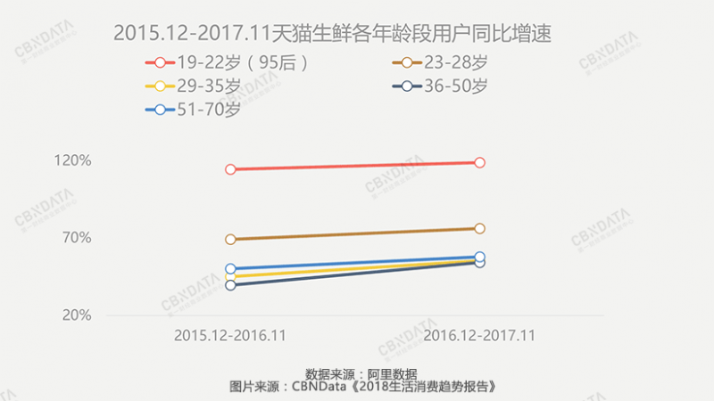 CBNData和口碑合作的《2018生活消费趋势报告》显示,95后是天猫生鲜用户中增速最快的年龄段,2017年的增速接近120%!