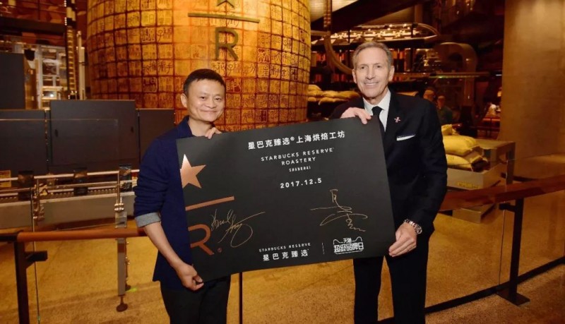 2017年12月,星巴克与阿里巴巴联手,在上海打造了亚洲首家全沉浸式咖啡体验店——星巴克臻选上海烘焙工坊。作为星巴克旗下最高端的门店,2014年第一家臻选烘焙工坊在星巴克总部所在地西雅图开张,上海则是全球第二家。开业当天,马云特地从乌镇的互联网大会赶来,与星巴克创始人霍华德·舒尔茨共同为新店揭幕,还用英语表示:“我不喜欢咖啡,但我喜欢星巴克”。