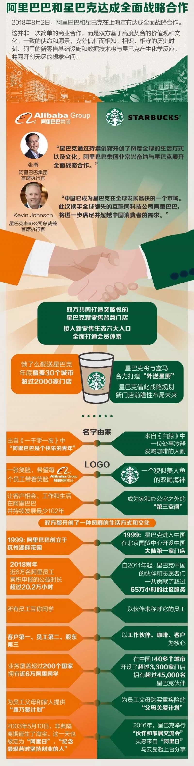 近20年来,诞生于美国的星巴克把喝咖啡变成无处不在的生活方式,阿里巴巴也成长为具有全球影响力的科技公司。如今,阿里巴巴和星巴克,正在共创一种新零售的新生活方式。