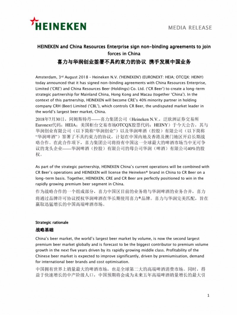 在此合作项下,喜力集团公司将持有中国这一全球最大的啤酒市场当中无可争议的龙头企业——华润啤酒(控股)有限公司的母公司华润(啤酒)有限公司40%的股权。