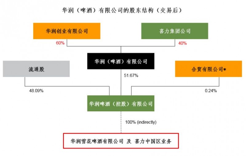 1)喜力将收购华润集团(啤酒)有限公司40%的股权,而华润创业则持有其余60%的股权。双方将为此签订股东协议。华润集团(啤酒)有限公司持有华润啤酒(控股)有限公司51.67%的控股权,后者在香港联合交易所主板上市并在中国经营啤酒业务。