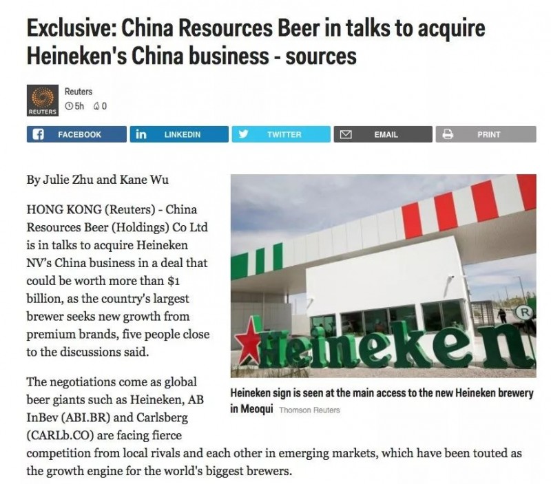 事实上,早在今年3月,路透社就以独家报道的方式称华润啤酒正在寻求对喜力在华业务的收购。