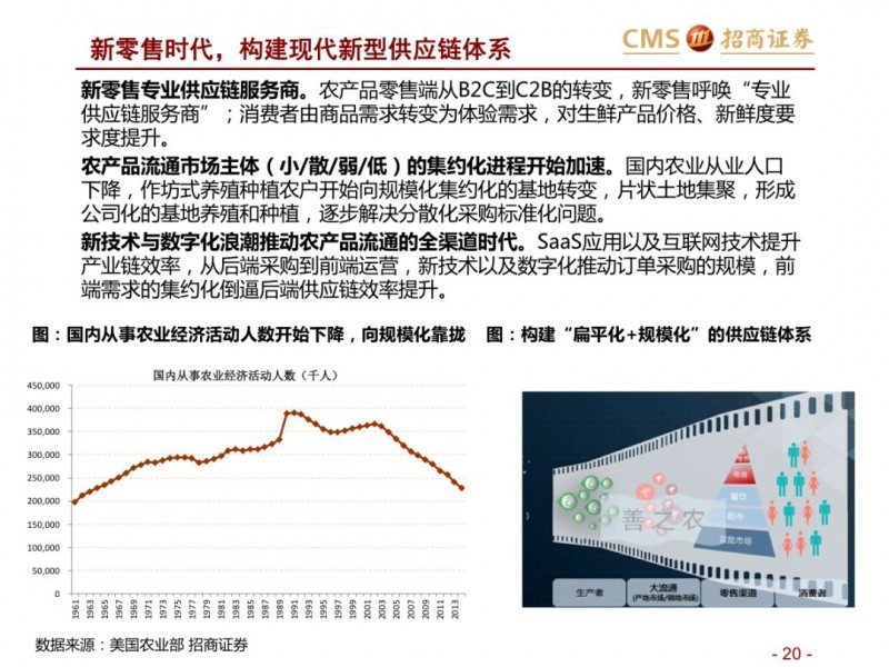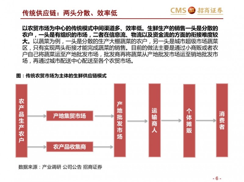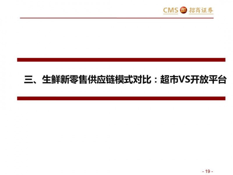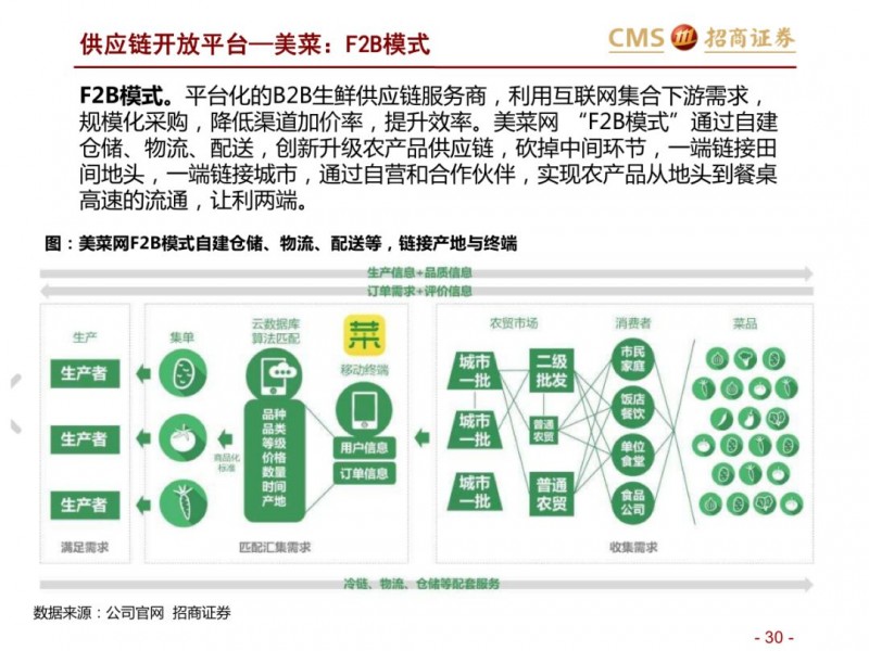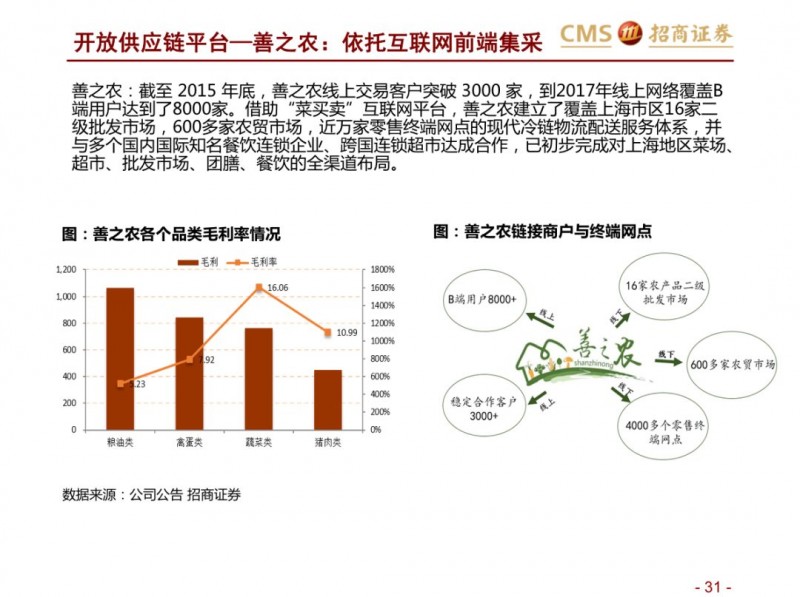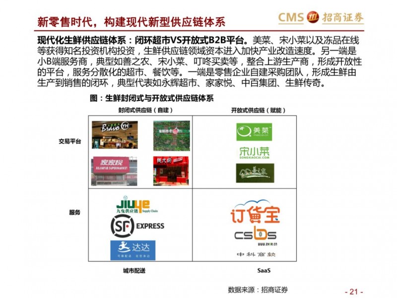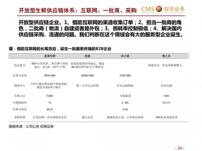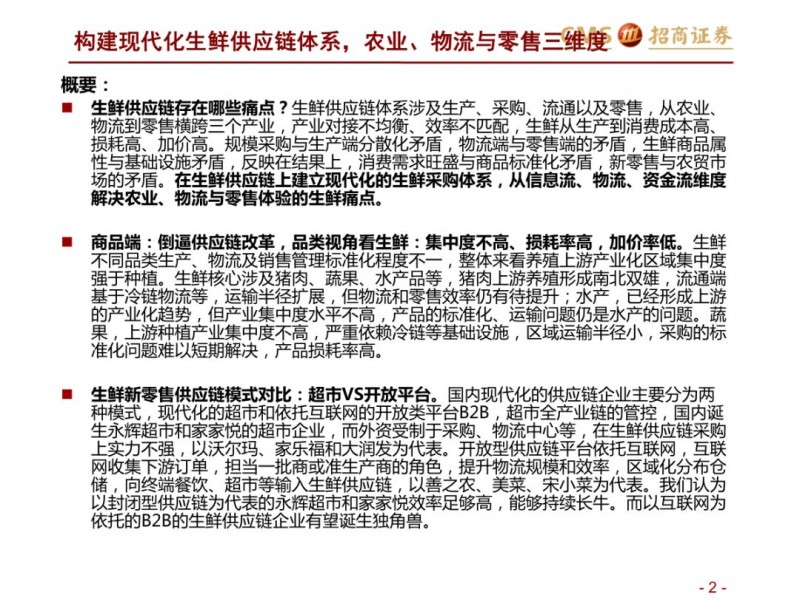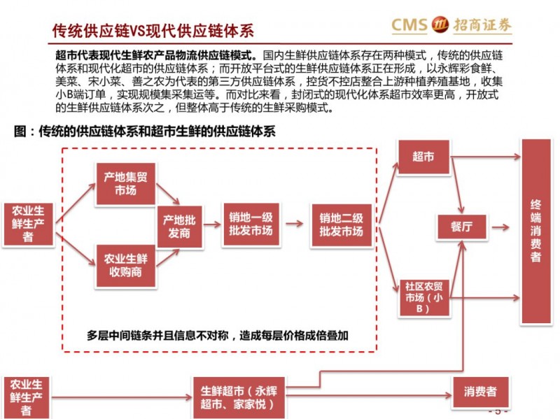 生鲜新零售供应链模式对比:超市VS开放平台。国内现代化的供应链企业主要分为两种模式,现代化的超市和依托互联网的开放类平台B2B,超市全产业链的管控,国内诞生永辉超市和家家悦的超市企业,而外资受制于采购、物流中心等,在生鲜供应链采购上实力不强,以沃尔玛、家乐福和大润发为代表。开放型供应链平台依托互联网,互联网收集下游订单,担当一批商或准生产商的角色,提升物流规模和效率,区域化分布仓储,向终端餐饮、超市等输入生鲜供应链,以善之农、美菜、宋小菜为代表。我们认为以封闭型供应链为代表的永辉超市和家家悦效率足够高,能够持续长牛。而以互联网为依托的B2B的生鲜供应链企业有望诞生独角兽。