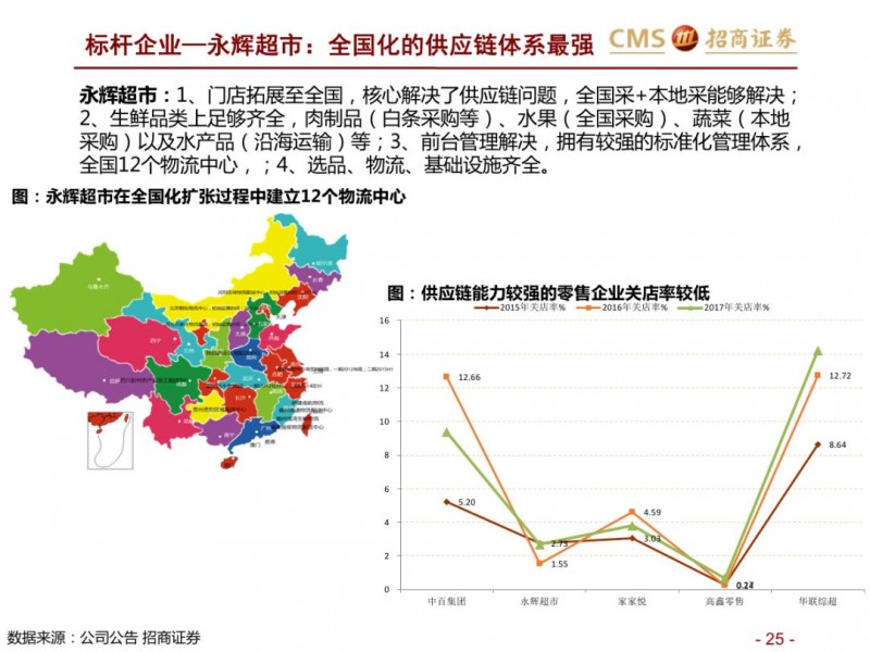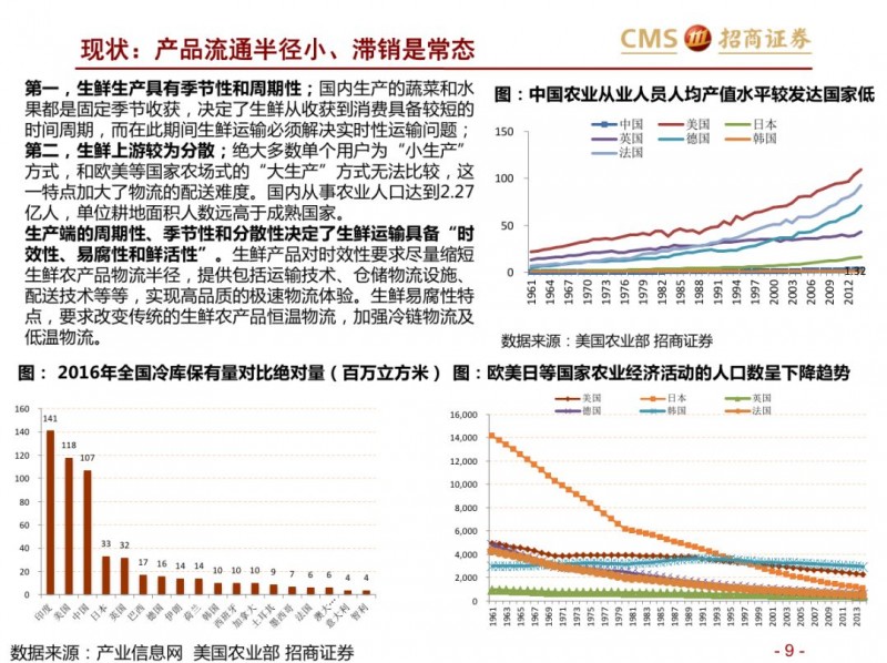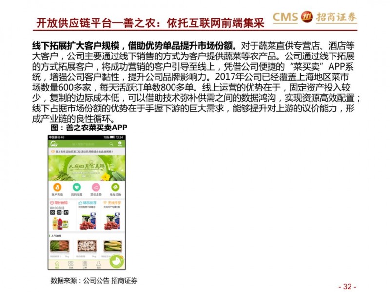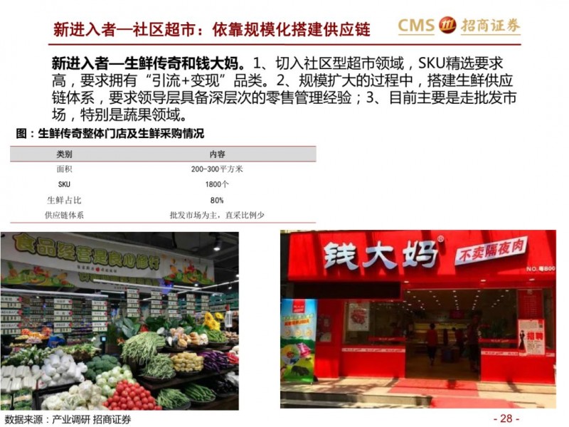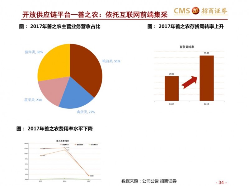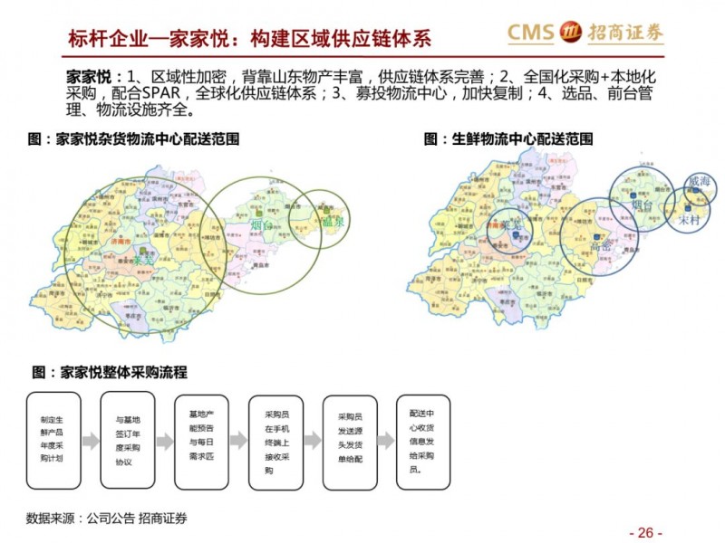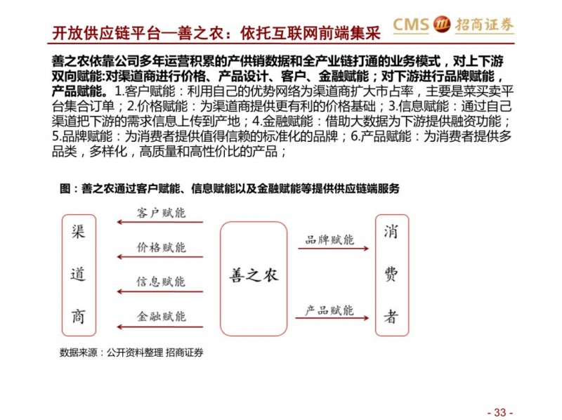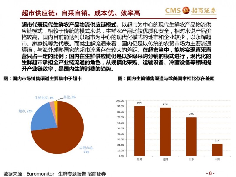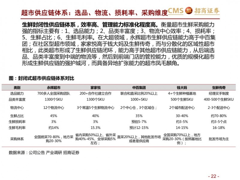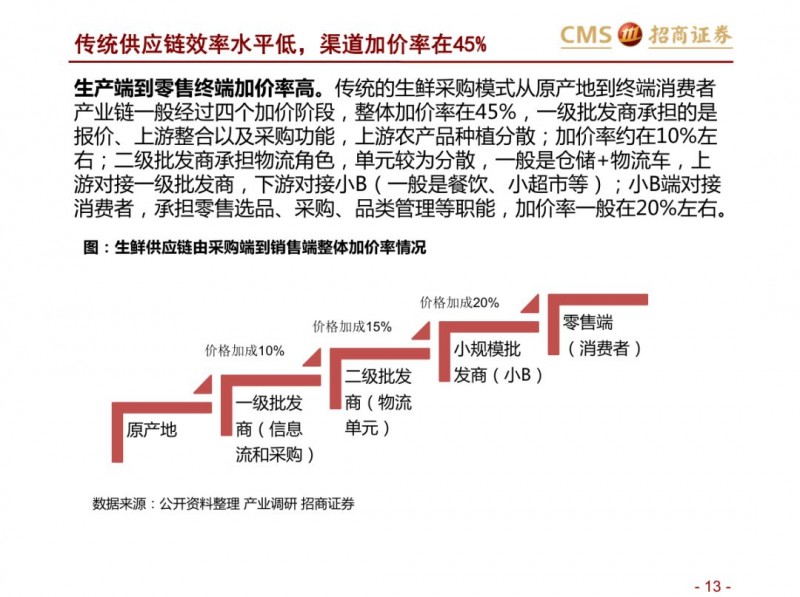 生鲜新零售供应链模式对比:超市VS开放平台。国内现代化的供应链企业主要分为两种模式,现代化的超市和依托互联网的开放类平台B2B,超市全产业链的管控,国内诞生永辉超市和家家悦的超市企业,而外资受制于采购、物流中心等,在生鲜供应链采购上实力不强,以沃尔玛、家乐福和大润发为代表。开放型供应链平台依托互联网,互联网收集下游订单,担当一批商或准生产商的角色,提升物流规模和效率,区域化分布仓储,向终端餐饮、超市等输入生鲜供应链,以善之农、美菜、宋小菜为代表。我们认为以封闭型供应链为代表的永辉超市和家家悦效率足够高,能够持续长牛。而以互联网为依托的B2B的生鲜供应链企业有望诞生独角兽。
