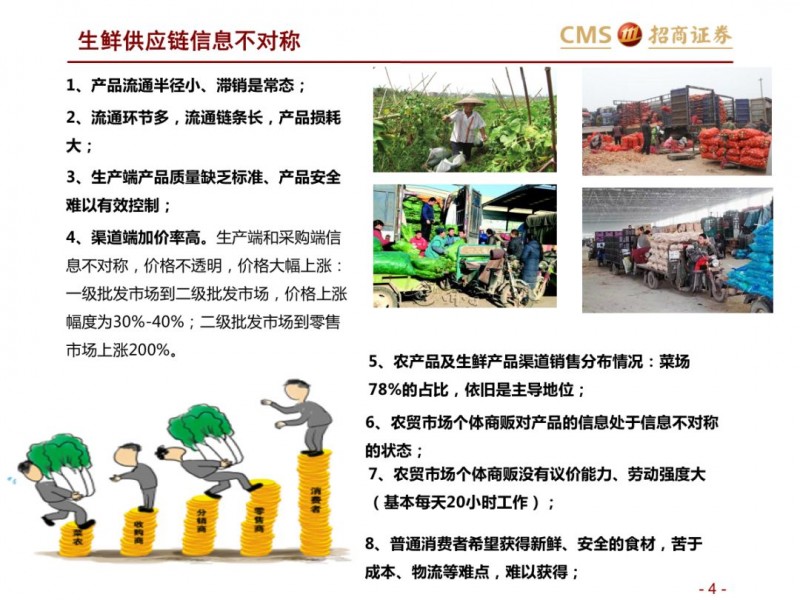 生鲜供应链存在哪些痛点?生鲜供应链体系涉及生产、采购、流通以及零售,从农业、物流到零售横跨三个产业,产业对接不均衡、效率不匹配,生鲜从生产到消费成本高、损耗高、加价高。规模采购与生产端分散化矛盾,物流端与零售端的矛盾,生鲜商品属性与基础设施矛盾,反映在结果上,消费需求旺盛与商品标准化矛盾,新零售与农贸市场的矛盾。在生鲜供应链上建立现代化的生鲜采购体系,从信息流、物流、资金流维度解决农业、物流与零售体验的生鲜痛点。