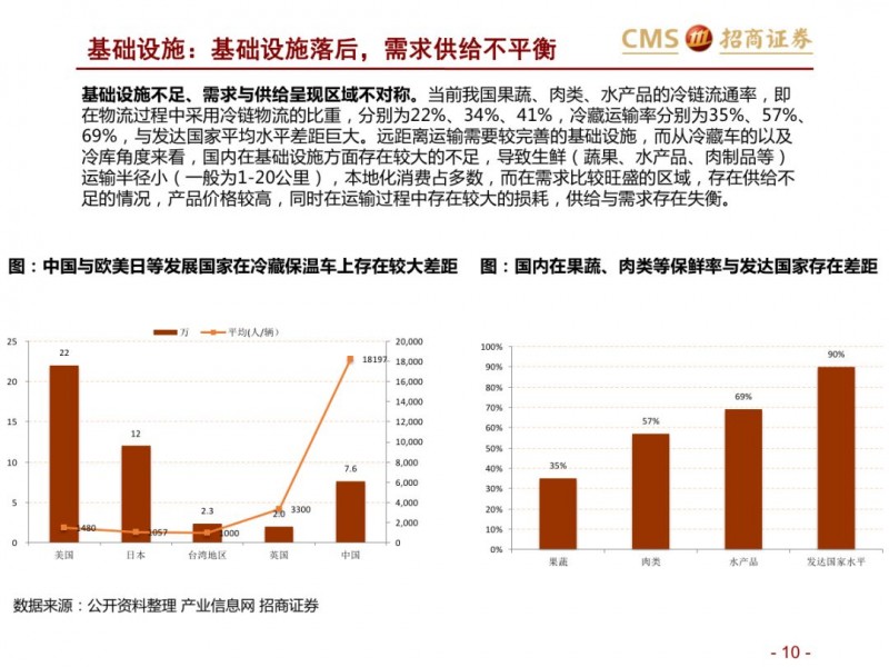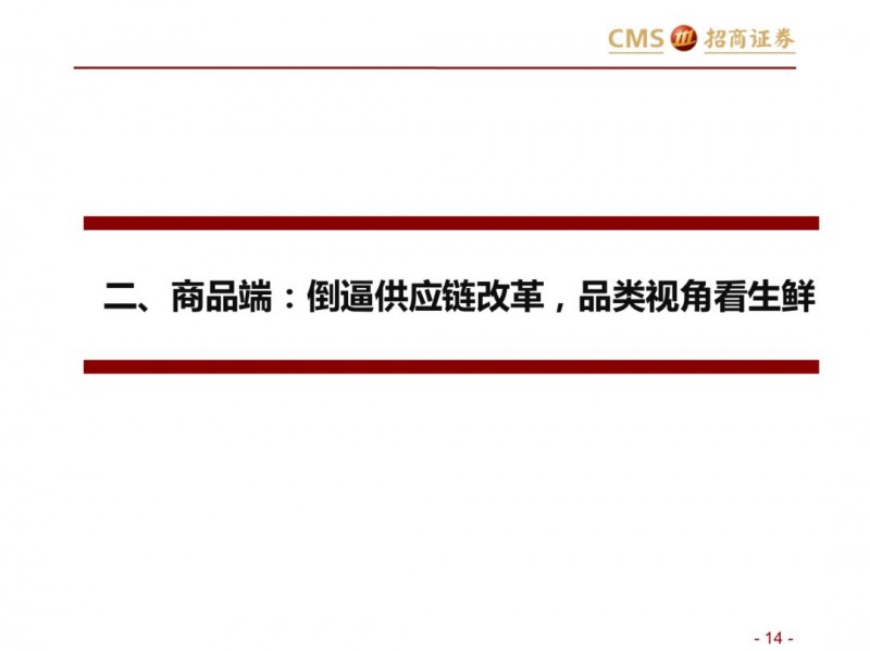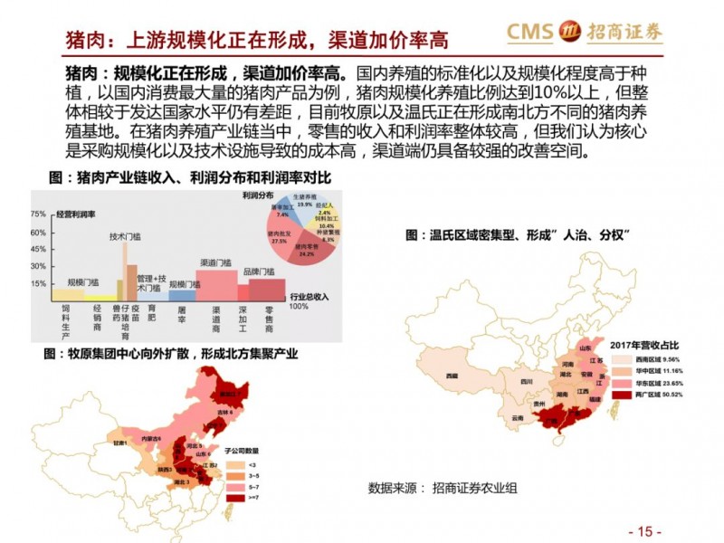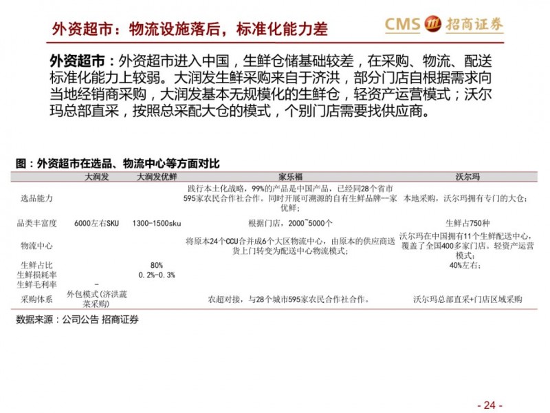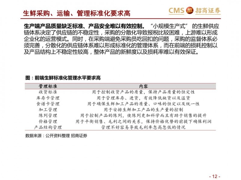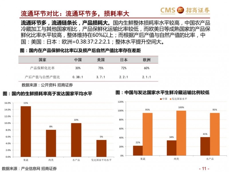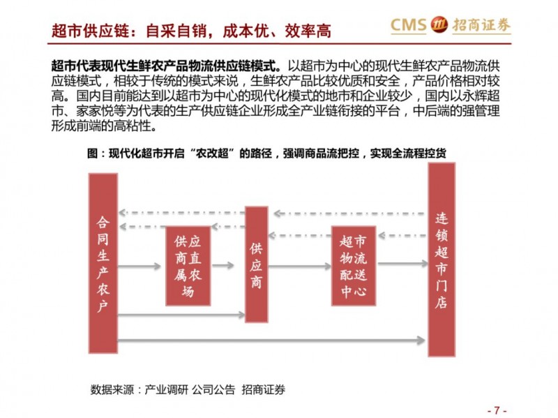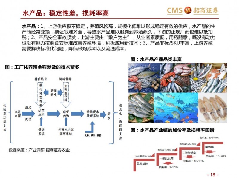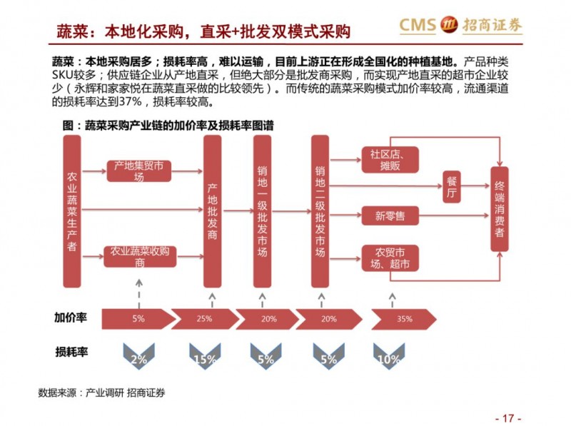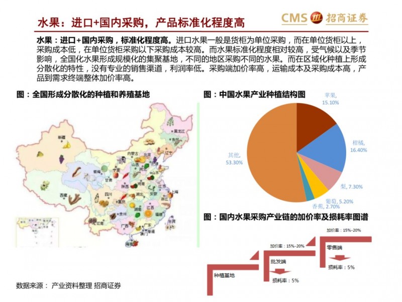 商品端:倒逼供应链改革,品类视角看生鲜:集中度不高、损耗率高,加价率低。生鲜不同品类生产、物流及销售管理标准化程度不一,整体来看养殖上游产业化区域集中度强于种植。生鲜核心涉及猪肉、蔬果、水产品等,猪肉上游养殖形成南北双雄,流通端基于冷链物流等,运输半径扩展,但物流和零售效率仍有待提升;水产,已经形成上游的产业化趋势,但产业集中度水平不高,产品的标准化、运输问题仍是水产的问题。蔬果,上游种植产业集中度不高,严重依赖冷链等基础设施,区域运输半径小,采购的标准化问题难以短期解决,产品损耗率高。