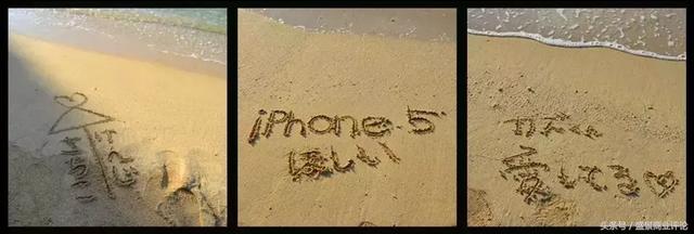 沙滩留言的图例。左:“幸子”“健二”同在爱心伞下;中:想要iPhone5(当时是2012年);右:小一,我爱你❤。该项目目前停止中。