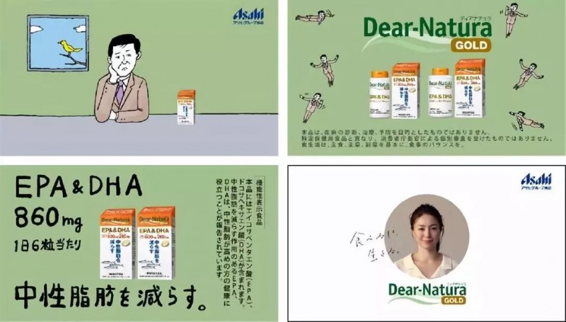 广告宣传手段也是商品取得成功的关键之一。2017年6月,朝日食品集团与知名漫画家和田ラヂヲ(radiowada)合作推出了Dear Natura黄金版EPA&DHA的“惊讶男”系列广告,从而扩大了商品的认知度。