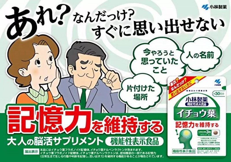 久负盛名的日本制药企业小林制药自然也不会错过这一商机,将目标人群锁定为中老年人群,推出了公司的首款功能性标示食品“Luteina”,并取得了不错的反应。随后小林制药也开发了银杏叶功能性产品,在2017年度的功能性标示食品排行榜中排第15位。
