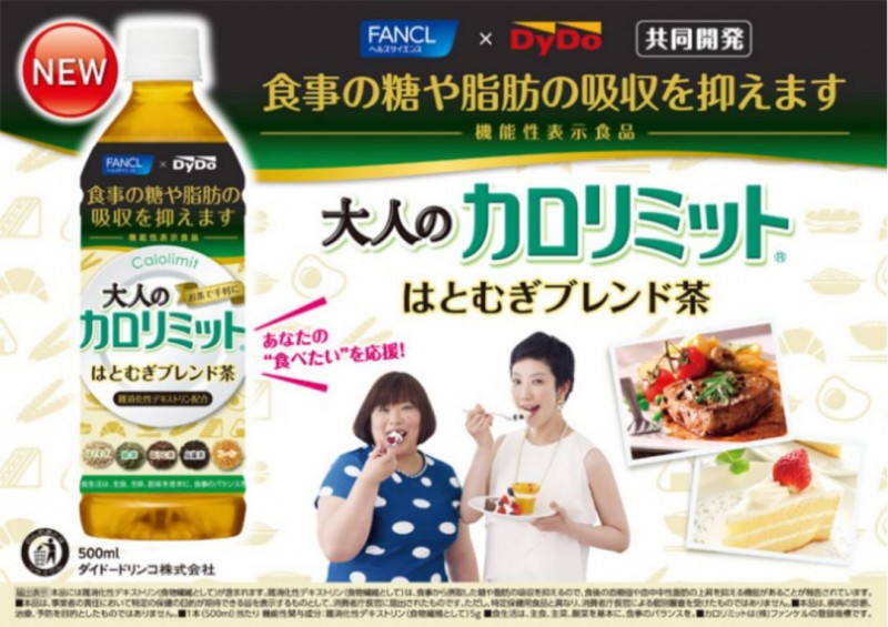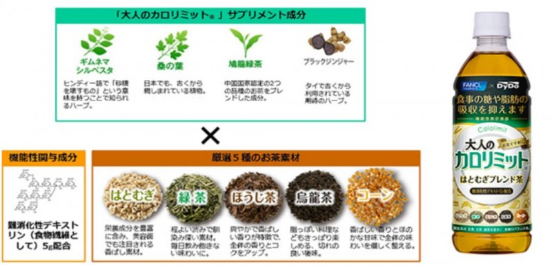 不仅如此,芳珂还与日本五大综合饮料商之一Dydo合作开发了能够轻松摄取抑制糖分、脂肪吸收成分的茶饮料——大人的Carolimit薏苡仁混合茶。
