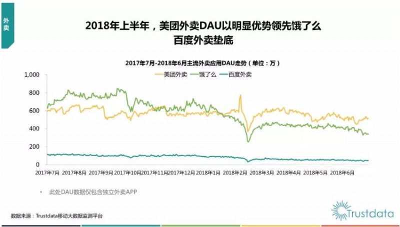 从Trustdata发布的外卖数据中可以看到,过去一年,美团外卖APP的DAU数据呈现稳中有升趋势,在独立APP流量上领先饿了么。除此之外,美团APP、大众点评APP和美团外卖APP还组成了生活服务矩阵。此前美团点评招股书中透露了其2017年度交易用户数为3.1亿,更不用说拥有9亿日活的微信和5亿日活的手机QQ都为其加持。