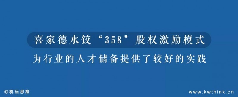 相比之下,喜家德水饺自创的358合伙模式,则很好地解决了企业扩张过程中的人才短缺问题。3是3%,店长考核成绩排名靠前的,可获得3%的分红;5是5%,如果店长培养出新店长,就有机会成为小区经理,并可在新店投资入股 5%;8是8%,如果一名店长培养出5名店长,则成为区域经理,可以在新店投资入股8%。