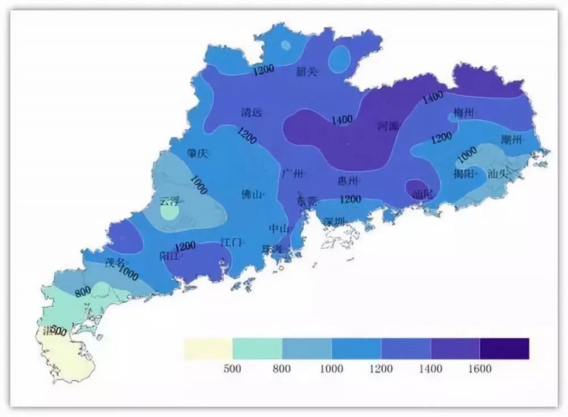 广东位于南岭以南,南海之滨,是中国光、热和水资源最为丰富的地区之一,尤其是降水,广东降水充沛,年平均降水量在 1300 ~ 2500 毫米之间,全省平均为 1777 毫米。