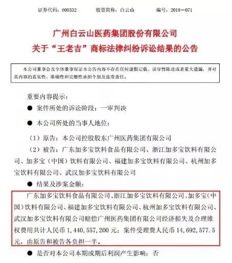 关于那场究竟谁是中国真正的红罐凉茶的争吵,已经持续了 6 年,近日,广东高院关于“王老吉”商标法律纠纷案件的一审《民事判决书》的判决结果显示,加多宝集团相关的 6 家公司自判决发生法律效力起十日内,需赔偿广药集团相关经济损失及合理维权费用共计 14.41 亿元。