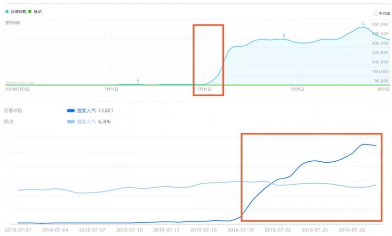 7月19日开播以来,“延禧攻略”百度指数疯狂走高,而“脉动”是一条平坦直线,热度并没带起来。在生意参谋上,脉动搜索人气略有上升,没持续多久又恢复播出前水平。是因为我们璎珞小姐姐不带货吗?当然不是!淘宝搜索“延禧攻略”的热度可是持续暴增。