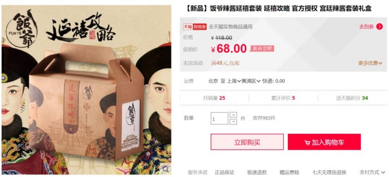 农夫山泉此次推出的定制水,主题是“长白山”,与《盗墓笔记》的某一情节完美契合。不知道的童鞋,可以百度“张起灵十年之约”。融入剧情,粉丝自然乐意买单。再反观绑定《延禧攻略》IP的饭爷辣酱,暂时没找到能跟璎珞小姐姐升华下友谊的点。讲真,现在玩IP定制的品牌挺多的,没点创意,很难让人记住。