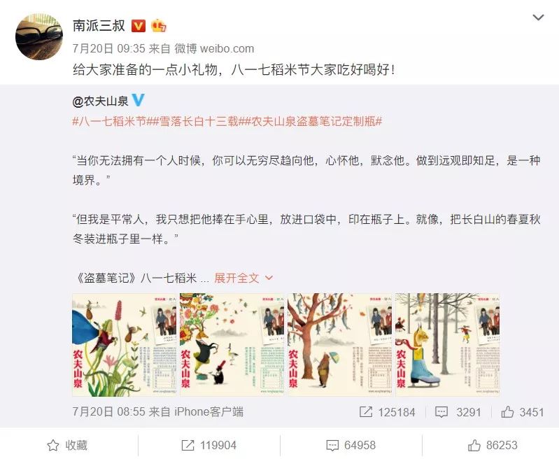 7月20日《沙海》开播当天,农夫山泉在微博公布定制款瓶身图案,稻米会官微和南派三叔先后转发,尤其后者,这条微博评论及点赞已远超农夫山泉。而截至发稿,粉丝为这个节日专门建立的微博话题#雪落长白十三载#已有2146万阅读,不少人在话题里询问定制瓶何时上市。产品还未上架,淘宝搜索“盗墓笔记 农夫山泉”热度上月底已经暴涨。