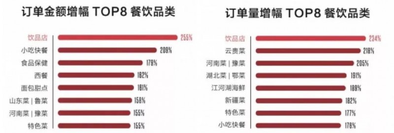 饮品大爆发,“饮”和“餐”平分秋色:2017年,饮品这一细分品类迎来爆发,呈现出高进场率、高关注度、高增长量的特点。主要品类的订单量以及订单金额的增长来看,饮品的同比增长均超过了200%,位列第一。