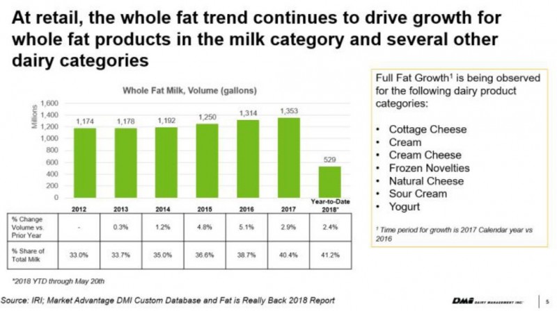 越来越多的品牌开始涌入全脂产品市场,因为它们更容易产生饱腹感,从而减少消费者在短时间内重复产生的零食欲望。据IRI数据显示,虽然Halo Top等低脂品牌在冰淇淋市场中越来越受欢迎,但全脂乳制品在牛奶、酸奶和其他乳制品类别中的吸引力也越来越大,而且由于全脂牛奶的消费需求增长,牛奶的销量已从2012年的33%上升到2018年前五个月的40%以上。消费者更加关注的不再是脂肪的摄入量,而是脂肪的质量。尤其是在欧美市场,人们认为草饲奶牛的牛奶会产生更高质量的脂肪,所以这类产品在市场上也倍受欢迎。