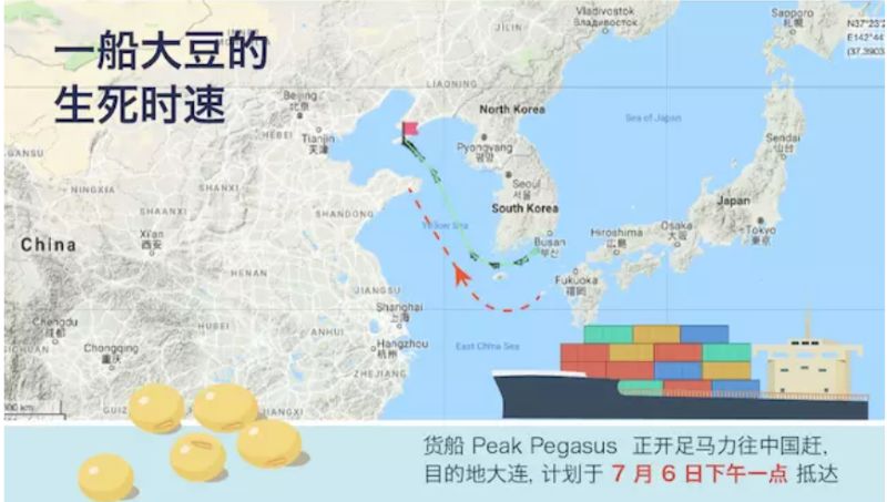 2018年的7月6日,那艘全民关注的名为飞马峰号Peak Pegasus、满载美国大豆的货船经过一天飞速狂飙,终于在下午4点50到达大连港,但还是没能赶上海关下班,这意味着货主将要多交几千万元的关税。