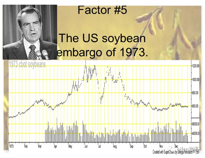 1973年全球粮食减产,美国大豆库存不足。尼克松总统颁布法令,禁止大豆和豆粕出口;在大豆几乎全靠进口的日本引发了“豆腐骚动”,日本开始实施海外农业战略,首先前往巴西投资,巴西的大豆产业由此起飞;