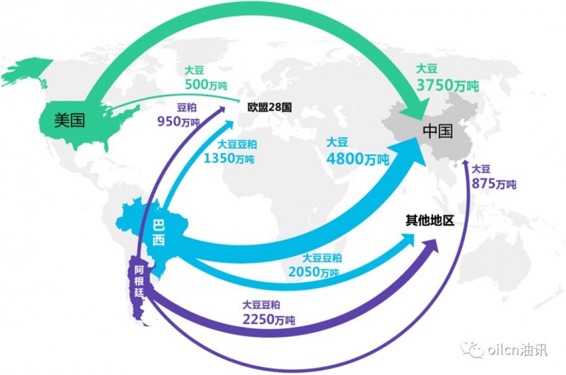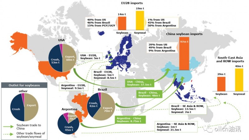 国际大豆产销流:中国进口了全球大豆的60%,欧盟和东南亚地区进口了全球豆粕60%,阿根廷和巴西出口了60%的大豆,图片来源:荷兰合作银行