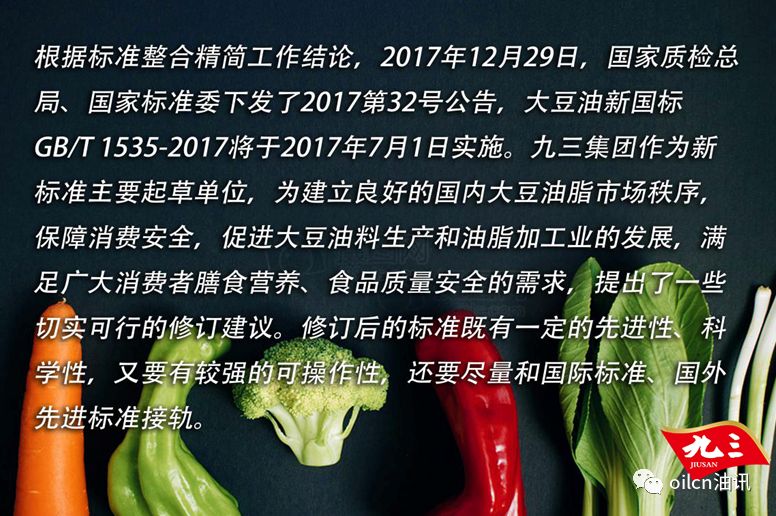 7月1日《大豆油》新国标正式实施,油讯特邀新标准的主要起草单位、中国豆油领军企业——九三集团,为大家解读新国标: