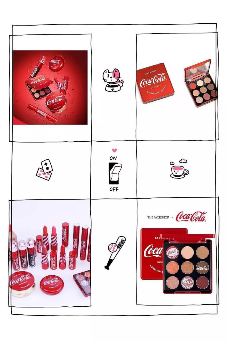 可口可乐也曾经涉足过美妆行业。早前,可口可乐与韩国彩妆品牌牌The Face Shop联名,推出了一套由内而外可乐风十足的全系列彩妆。联名款包括9色眼影盘、气垫BB、粉饼、唇膏、唇釉和染唇液六个品类。