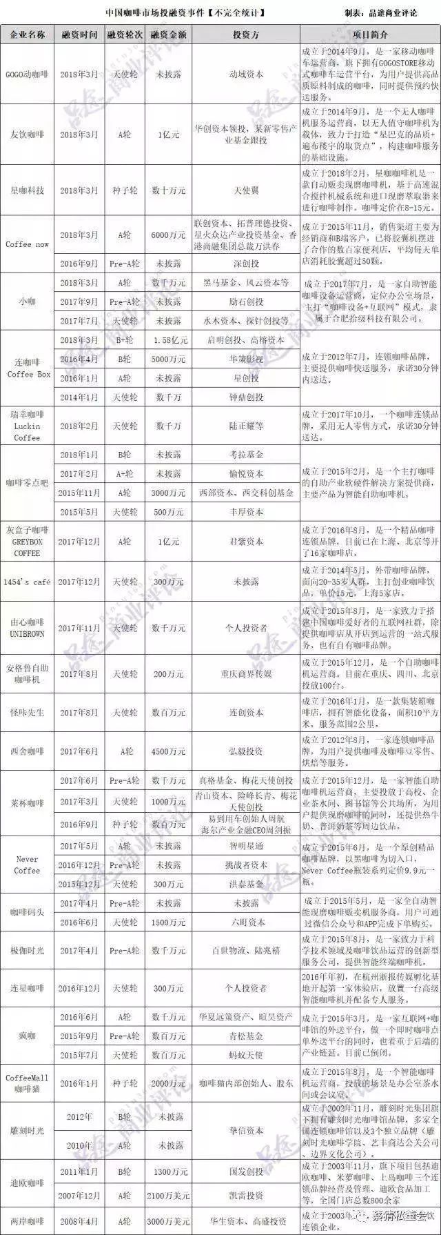 梳理近十年咖啡行业的投融资事件发现,在2008年~2015年,资本在咖啡消费领域下注很少,并且投资的都是咖啡馆连锁企业。