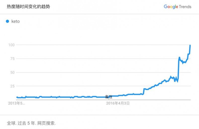 在美国消费者中生酮饮食人群逐渐扩大,据Google搜索趋势数据显示,代表生酮这一字眼的“Keto”的搜索量在今年4月22日-4月28日达到了5年来的搜索高峰。