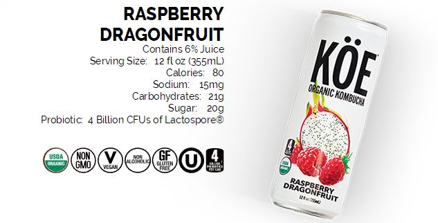 KÖE Organic Kombucha采用有机和非转基因成分制成,将传统特色的发酵茶和各种水果口味相融合。既保留传统康普茶的所有好处,拥有数十亿活的益生菌,同时又不牺牲美味。上市之初一共有柠檬姜、芒果、覆盆子柠檬、蓝莓姜和覆盆子火龙果五款口味。KÖE希望吸引90%未涉足康普茶的消费人群进入该品类。